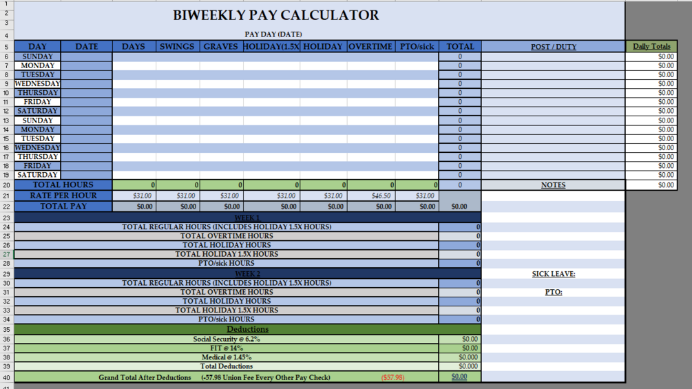 ✅ Clean, Professional Design – Easy-to-read layout with clear sections for each week, deductions, and grand totals.